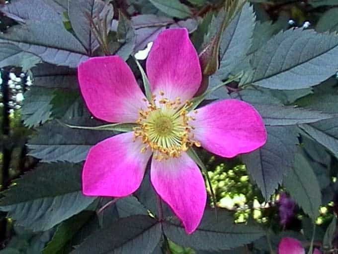 Små, enkle, rosa blomster med hvitt senter, og svak duft. Blomstene sitter enkeltvis eller 2-5 sammen. Blomstring varer i 4 uker fra midt i juli til midt i august. Brunrøde, eggformete til nesten runde, 1-1,5 cm lange nyper.